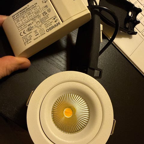 Produktet består av innfellingsspot med fast LED-modul og separat driver som kobles til 220–240V strømnett. Passer som innfelt belysning i tak eller nedsenket himling der det er plass til innbygging av downlight.