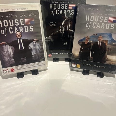 House of Cards DVD-bokser med sesong 1 og sesong 2. Inneholder episoder fra den amerikanske TV-serien samlet i to separate DVD-utgaver. Egnet for avspilling på DVD-spiller som støtter regionen utgivelsen tilhører. Passer for seere som ønsker serien i fysisk DVD-format.