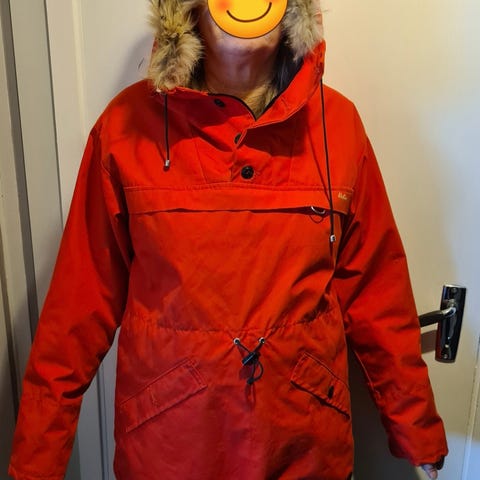 Fin anorakk med mange fine detaljer. Knepping og glidelås i hals, hette med pelskant og glidelås i siden. Merke med Nikita på ryggen. Normal i størrelsen. Pent brukt!