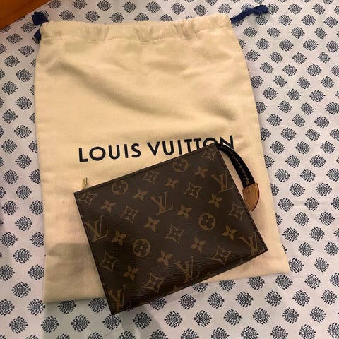 Louis Vuitton clutch veske i lær for dame. Vesken er i svart skinn med preget monogram-mønster og glidelåslukking øverst. Passer til oppbevaring av mindre eiendeler som mobil, nøkler og lommebok, og kan brukes både alene som clutch eller som innerveske i en større bag eller veske.