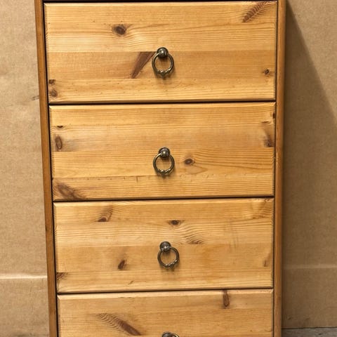 Den har 6 romslige skuffer (2 små øverst og 4 store) som glir fint, og runde trehåndtak på alle skuffene. Kommoden står stødig og har kun noen få bruksmerker, men er generelt i god stand.