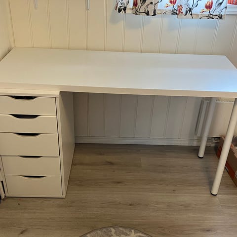 Kontormøbler fra IKEA selges rimelig. Hjørnepult 200 x 220 cm, 2 skap med skuffer og skap pluss skuffeseksjon til å ha under pulten. Møblene har vært i bruk i mange år men er i god stand. Selges samlet for 1000 kroner
