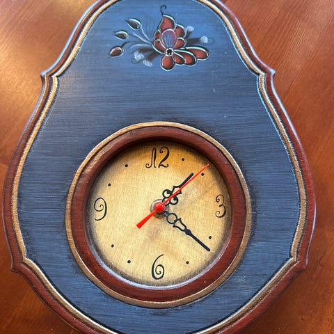 Veggur i tre med organisk, uregelmessig form. Klokken er laget av et massivt trestykke med synlig årringer og mørke, brune nyanser. Tallene er plassert direkte på treverket, og viserne er i metall med dekorativ utforming. Baksiden har innfelt urverk med batterirom og opphengsbeslag for montering på vegg. Egner seg som veggklokke i stue, gang eller andre oppholdsrom. Denne klokka går som den skal.