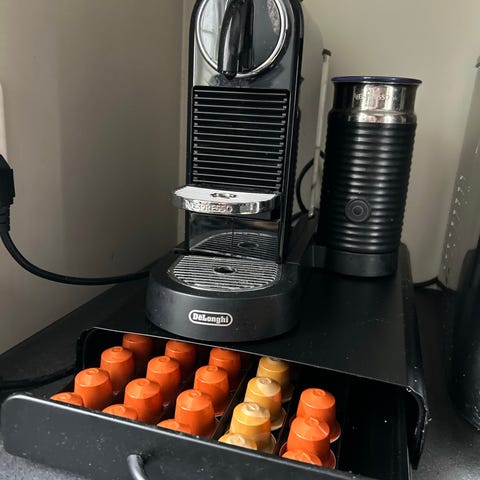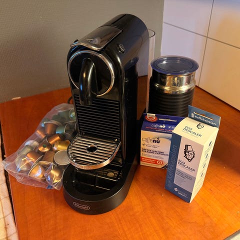 Maskinen er beregnet for bruk med Nespresso-kapsler, og har betjeningsknapper på toppen for ulike kaffefunksjoner. På siden er det et dreiehjul for justering av innstillinger, for eksempel koppstørrelse eller mengde. Vannbeholder og kapselinnføring er plassert på toppen/front.