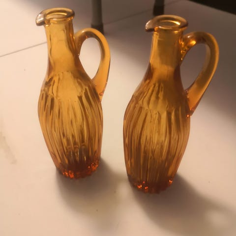 Vintage olje /vineger karaffel sett med stål stativ. Selges.