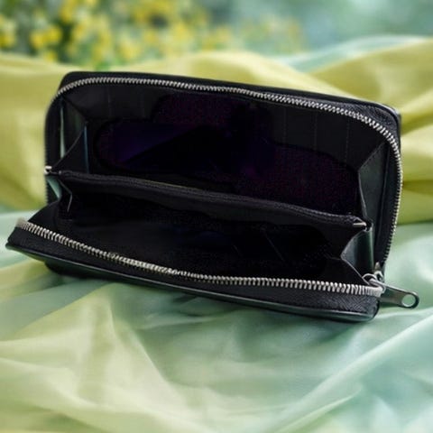Primark lommebok i kunstlær for dame. Lommeboken er svart med quiltet mønster og har glidelåslukking rundt kanten. Innvendig har den flere rom, blant annet et mindre rom med glidelås som kan brukes til mynter, samt åpne rom for sedler og kort. Praktisk størrelse som passer i de fleste vesker og jakker.