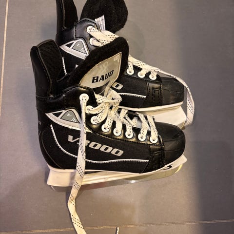 CCM ishockeyskøyter for barn i størrelse 32. Skøytene har svart overdel med hvite lisser og polstret innside for økt komfort. Blad i metall med sort holder, egnet for bruk på isbaner til ishockey og generell skøytebruk.