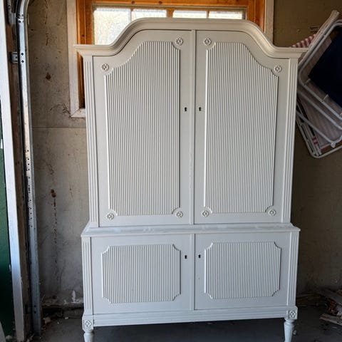 Gustaviansk skap med mye plass til oppevaring men allikevel smekkert. Malt i bengalakk i fargen labrador. Dvs nydelig gråfarge som passer til alt. Blank og speilende. Selger også tilhørende skjenk.