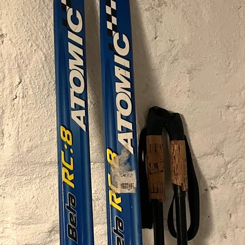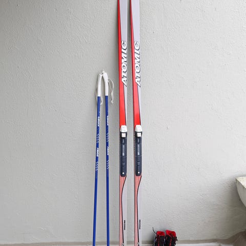 Atomic langrennski på 196 cm med tilhørende TecnoPro skisko i størrelse 39 (EU). Skiskoene er hvite og svarte med snøring og glidelås-lukking over vristen. De har mykt, fôret innside for økt komfort. Skiene har klassisk langrennsprofil.