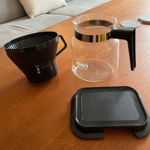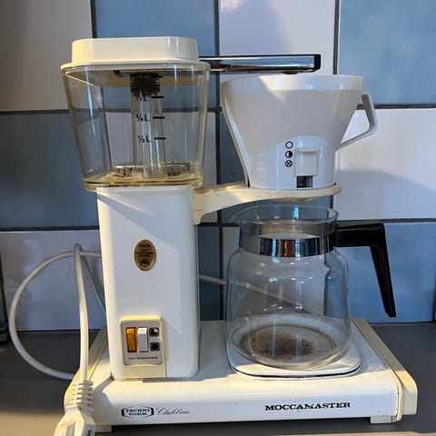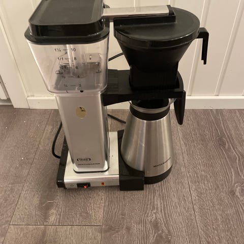 Moccamaster kaffetrakter deler. Glasskanne med håndtak, filterholder i plast, lokk og diverse plast- og metalldeler som hører til kaffetrakteren. Nøyaktig modelltilhørighet er ikke spesifisert og bør kontrolleres mot egen maskin.
