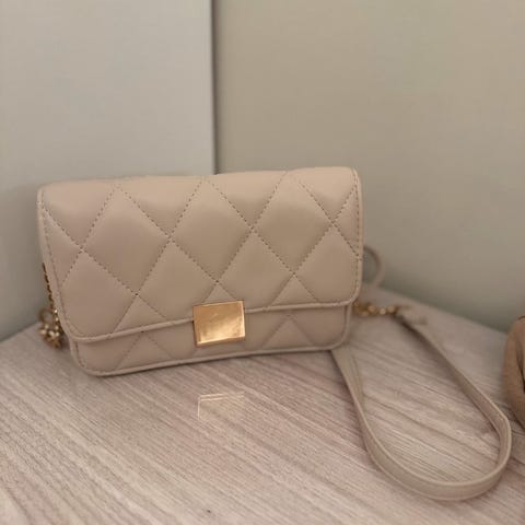 Vesken har quiltet overflate og gulldetaljer, inkludert lenkestropp som kan bæres på skulder.
