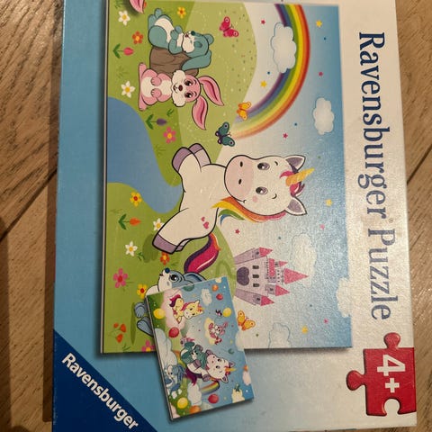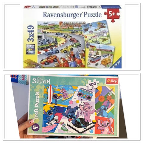 Blandet lot med barnepuslespill fra Trefl og Ravensburger. Motivene inkluderer blant annet Marvel Spidey and His Amazing Friends, Paw Patrol, Sonic the Hedgehog, Hakkebakkeskogen og ulike landskapsmotiver. Flere av settene inneholder flere puslespill i én eske, med varierende antall brikker som passer for barn i ulike aldre (fra ca. 3 år og oppover). Egnet til rolig aktivitet hjemme, på hytta eller som felles aktivitet for barn og voksne. Puslespillene leveres i originalesker med motiv og informasjon om anbefalt alder og brikkeantall trykket på eskene.