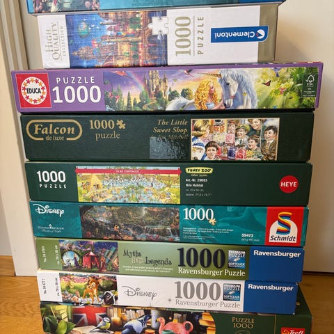 Selger pent brukte puslespill, 100kr pr stk. Den lille havfruen 80kr, mangler en brikke. Askepott, dumbo, disney jul, stitch, panorama og Bambi solgt.