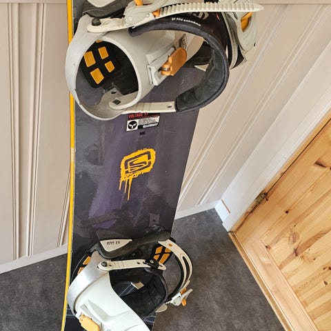 Snowboard med bindinger. Brettet har blå overside med grafikk og hvit underside. Målt til ca 115 cm. Litt rust. Mye bruk igjen. Helt kurant for nybegynner. Twin tip.