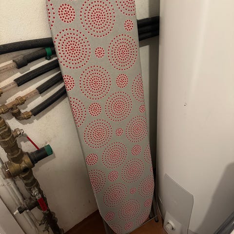 Gir bort et pent brukt strykebrett. Det har noen skjønnhetsmerker etter bruk i form av flekker fra steam (se bilde), men dette er trolig mulig å få bort i vask. Trekket kan tas av og kan også byttes om ønskelig.