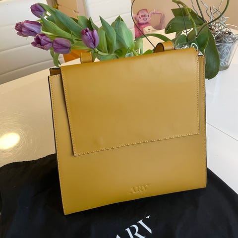 Vesken heter Eli mini II og er I fargen kastanje. Ekte skinn med en matt finish, fra Italia. Håndlaget i Spania, av det Ålesundsbaserte merket ARV. Innsiden har et hovedrom og to lommer, en med glidelås. Kort og lang avtakbare reimer. Vesken måler bredde 22 cm, høyde 16 cm og dybde 8 cm. Gullfargede metall- detaljer. Kun brukt en gang, fremstår som ny. Kjøpt våren 2025, nypris 3399, selges for 2000.