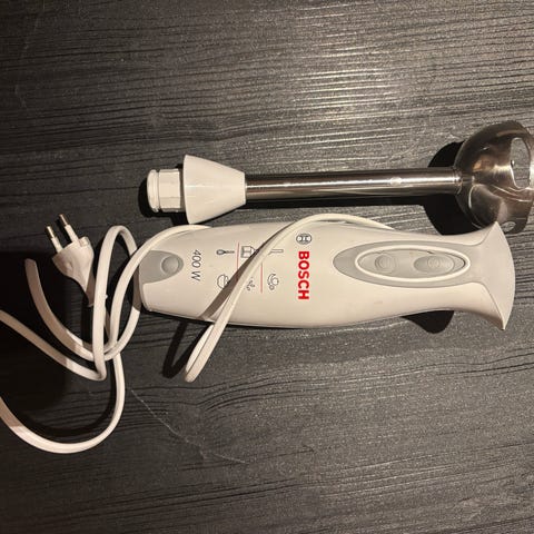 Braun stavmikser. Består av motorenhet og avtakbar stav med kniv i metall. Egnet til miksing og purering av supper, sauser, smoothies og lignende i kasseroller og boller. Enheten kobles til strøm med ledning.