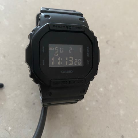 Jeg har byttet det opprinnelige baklokket i titan med et i stål, samt reimen med en i resin (begge fra en DW-M5610). Innmaten (modul og skjerm) og bezel er derimot original.