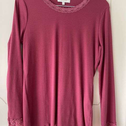 Janus ulltrøye i 100 % merinoull, rødfarget i størrelse small. Den har blondekant nederst på ermene (80 % merinoull og 20 % polyamid. Kun prøvd på én gang, ellers ikke brukt.