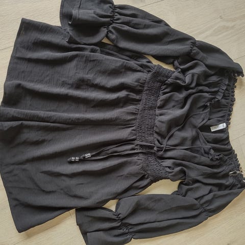 Elegant og delikat jumpsuit i lyocell som er kjent for å være slitesterkt, falle pent og er meget behagelig og mykt. Str. L/XL. Merke Amisu. Kort erm, full lengde er 132 cm. Farge svart. Hemper for belte på sider. Brukt kun et par ganger og er i flott stand.
