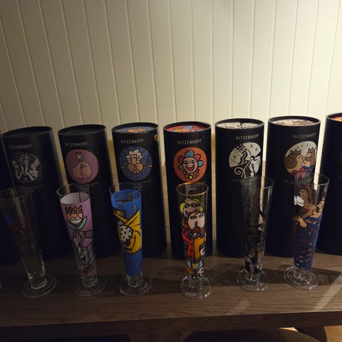 13 stk flotte Ritzenhoff ølglass, svært lite brukt. Det følger også med tre mindre Ritzenhoff «shotte-glass» og en mengde brikker.