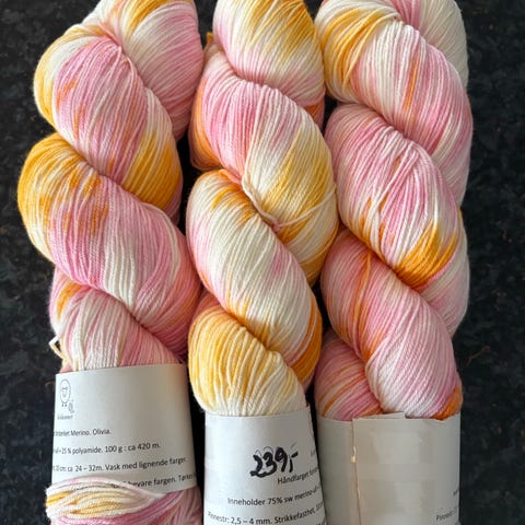 3 stk hesper håndfarget merinoull fra Kvitlammet i en lillatonefarge kalt Adeleide. Toner av lilla, rosa, gulbrune oransje/fersken.