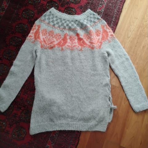 Strikket i Sandnes Sunday, fargene 1001 (True White) og 5223 (Lavender).