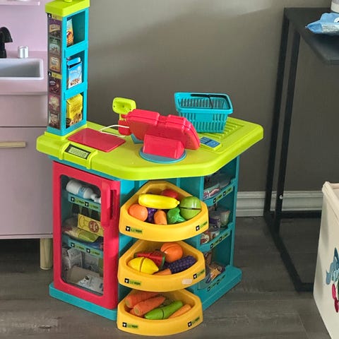Supermarket with scanner (with light and sound ) and lot of toy box to scan and trolly