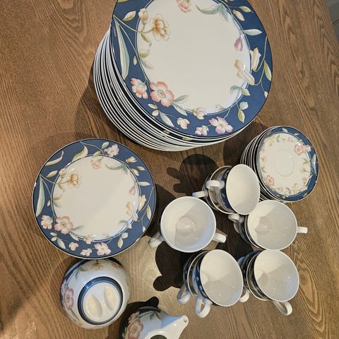 Middags og kaffeservise i mange deler. Opprinnelig til 12 men ikke helt komplett. F.eks. kaffekopper til 9 men flere tefat og asjetter. 11 middagstallerkener. Flere serveringsfat. Se bilde. Selges samlet. Må hentes.