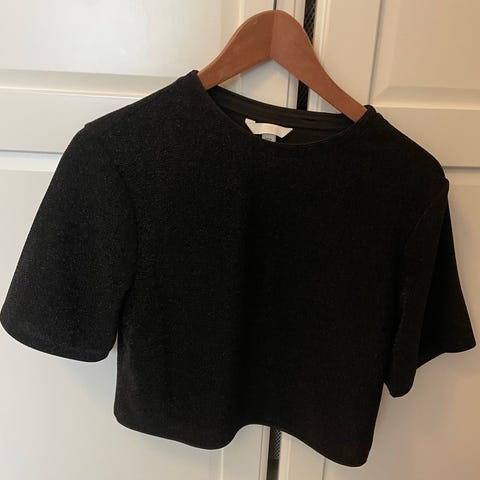 H&M topp for dame i størrelse XS. Toppen er blå og laget av polyester. Modellen har korte ermer og løs passform med snøring i halsen. Stoffet har en glatt, lett glans som gir et mykt uttrykk. Egnet til hverdagsbruk eller enklere penere anledninger, og kan brukes alene eller under jakke eller cardigan.