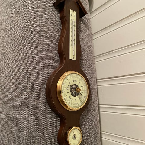 Barometer / Gradestokk , med teakfront , og side. Kan stå på hylle , eller henges på vegg . Kr. 150.-