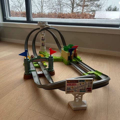 Hot Wheels Mario Kart lekesett bilbane. Plastbane med flere spor, svinger og elementer inspirert av Mario Kart-spillet. Inneholder blant annet tårn, start-/målport med flagg og rette banelengder. Passer til små lekebiler i Hot Wheels-størrelse. Én bil m/Mario medfølger. NB: Reklameskiltet (til venstre på bildet på esken) mangler, men banen fungerer helt fint uten. Anbefalt alder fra 5 år, ifølge esken.