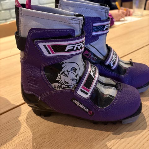 Alpina Frost skisko for barn i blå og hvit farge. Str 30. Modellen har borrelåsstropper over vristen og rundt ankelen for stabilitet og enkel justering, samt glidelås foran. Skoene er laget i syntetisk materiale med illustrasjon på siden. Egnet til langrenn for barn som trenger varme og støttende skisko.