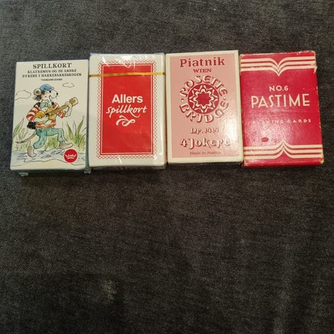 Danish Privat Klubb Duell kortstokker i original eske. Flere ulike design og farger, blant annet «Privat Klubb» og «Duell», samt kortstokker merket «Danish Playing Cards Bridge Canasta Poker». Standard kortstørrelse egnet til kortspill som bridge, canasta og poker. Passer for samlere eller til vanlig kortspillbruk.