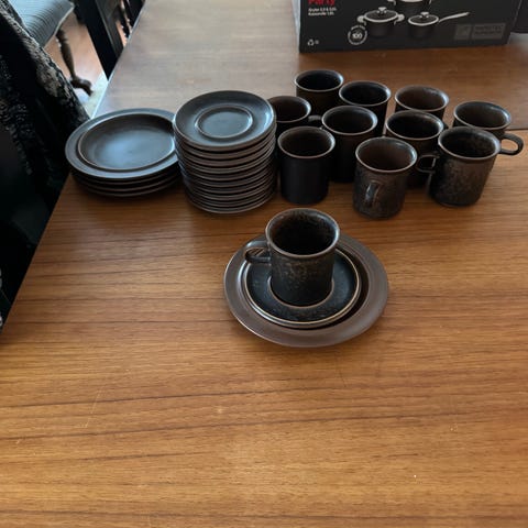 Service er pent brukt med to unntak. Den ene av de små bollene og én av tekoppene har en liten rift. Serviset passer til daglig bruk og kan brukes til servering av både varme og kalde retter.