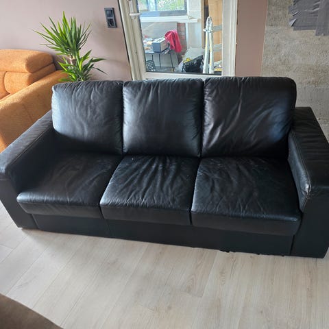 Skinnsofa svart 2+3 gis bort. Mye sofa igjen