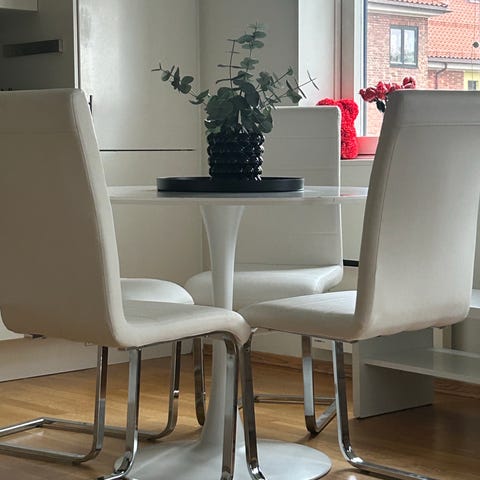 Spisegruppe med spisebord og 2 stoler. Usikker på merke, men alt er pent brukt og uten merker og skader. Må hentes på Majorstuen :)