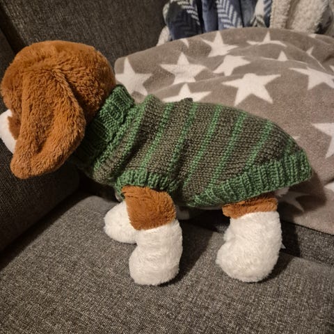Hundegenser strikket i superwash. Ca 25cm fra hals til enden. Med hull til sele. Passer liten hund, str xs