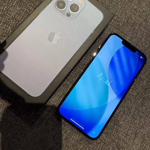 Selger en iPhone 13 Pro i fargen granitt. Telefonen er pent og forsiktig brukt, og har vært brukt med deksel, noe som har bidratt til å bevare tilstanden.