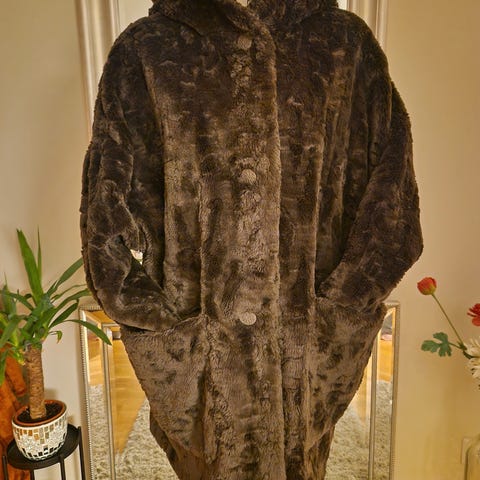 Lang grå kåpe med fuskepels på innsiden og stor hette. Beltet følger ikke med. Står ikke størrelse, men vist på en s/m