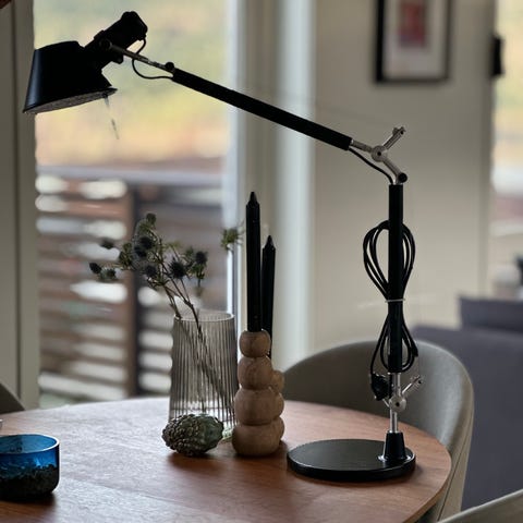 Selger en elegant og tidløs lampe i mørk metall med sort lampeskjerm (skjermen er litt falmet på den ene siden).