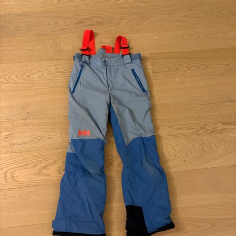 Hvit Helly Hansen skibukse for barn i størrelse 152. Den har knapp og glidelås i front samt beltehemper i linningen. HH-logo på låret.