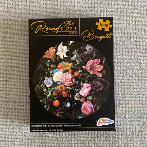 Selger et puslespill med 1000 brikker fra Round Art Puzzle. Puslespillet er rundt (sirkel) og heter Bouguet.
