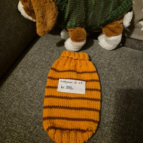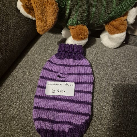 Hundegenser strikket i superwash. Ca 25cm fra hals til enden. Med hull til sele. Passer liten hund, str xs