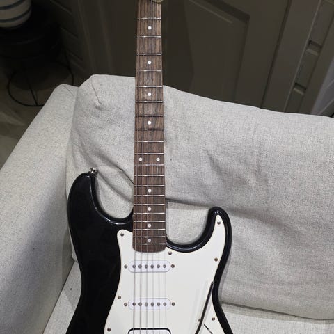 Svart elektrisk gitar i god stand, klar til spilling! Perfekt som første gitar, øvingsgitar eller til bandbruk. Komfortabel hals og humbucker-pickup gir god lyd. Noen kosmetiske merker, men fullt funksjonell.
