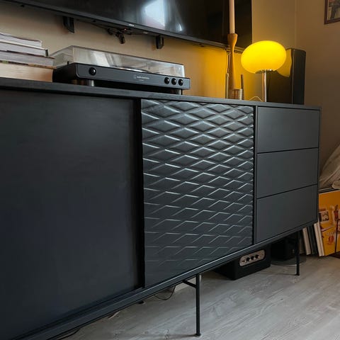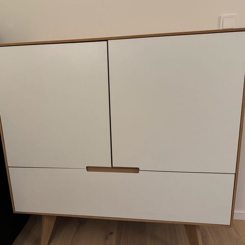 Bolia skjenk CASE reol designet av OOOJA. Skjenken har et moderne uttrykk med rette linjer og slanke ben. Den er laget av hel tre og utført i en mørk, blå finish. Fronten består av en kombinasjon av glatte og mønstrede flater, med skyvedører på den ene siden og tre skuffer på den andre siden. Skjenken gir god oppbevaringsplass til for eksempel servise, bøker, elektronikk eller annet utstyr, og kan brukes i stue, spisestue eller entré. Overflaten kan fungere som plass til TV, stereoanlegg, lamper eller dekorative gjenstander.