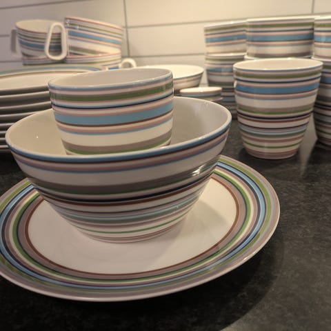 Iittala Origo servise i flerfarget porselen. Serviset består av 13 tallerkener, 6 krus og 4 eggeglass med karakteristiske horisontale striper i ulike farger.