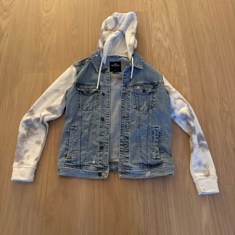 Hollister jakke i herremodell, størrelse M. Jakken er laget i blå denim med gråmelert hette og ermer i sweatshirt-materiale. Store Hollister- og California-trykk på ermene. Klassisk jeansjakke-fasong med brystlommer med klaff og sidelommer. Passer som en lett ytterjakke til hverdagsbruk.