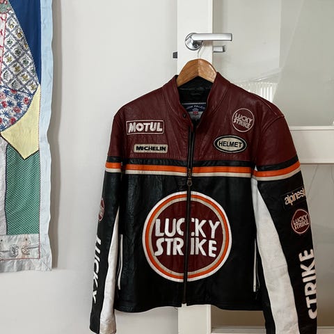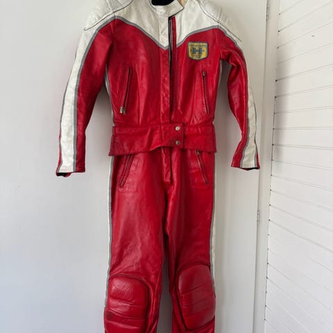 Skinnjakke for motorsykkel i rød og hvit farge. Jakken er laget i skinn og har størrelse 42. Den har polstrede partier på skuldre og albuer, samt kort modell som er typisk for MC‑jakker. Glidelås foran og justering ved ermene. Egnet som ytterjakke til motorsykkelkjøring eller annen bruk der man ønsker en kraftigere skinnjakke.