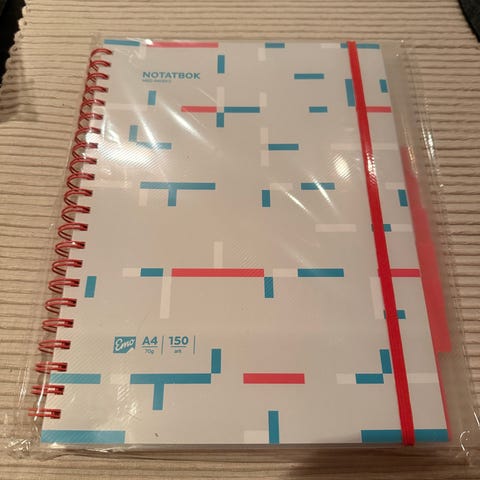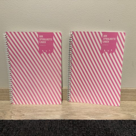 Fem stykker av linjerte skrivebøker og to stykker av rutebøker i A4 format.